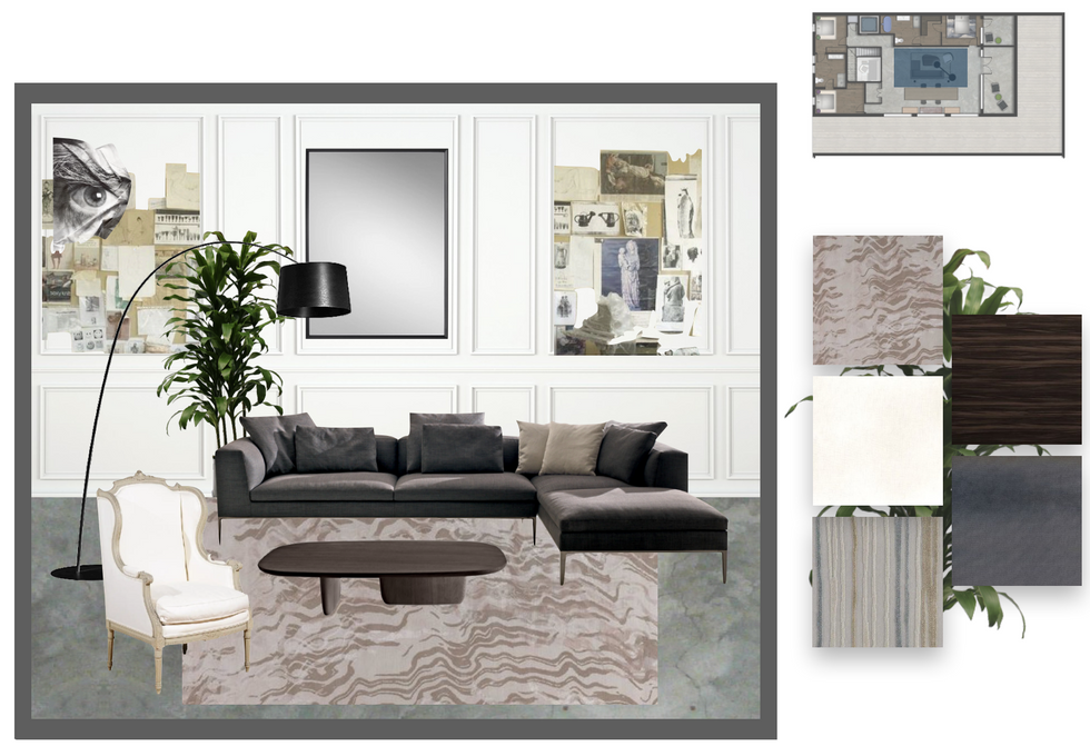 URBAN ECLECTIC - Creating a space with elements of brutalism, rustic industrialism, and classical French design in order to create an urban and eclectic indoor/outdoor space where the artist can appropriately showcase their work, as well as feel inspired.